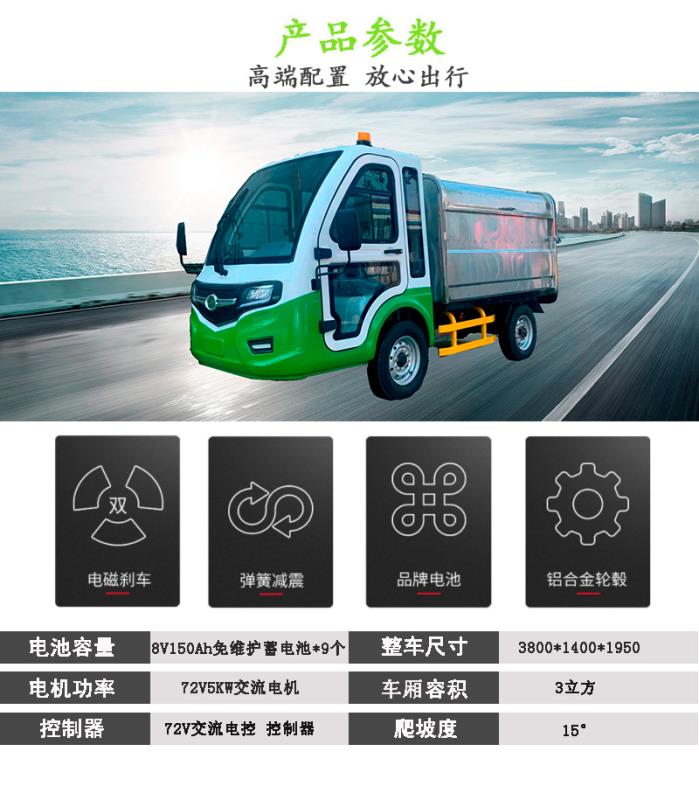 產(chǎn)品簡(jiǎn)介:容積:3立方。材質(zhì)為優(yōu)質(zhì)不銹鋼。車(chē)廂分為上下兩層,中間用可拆卸的鏤空隔板隔開(kāi),干濕垃圾有效分離。箱體尾部設置排水機構,方便污水排出。箱體尾部設置漏水槽,有效防止污水外溢。