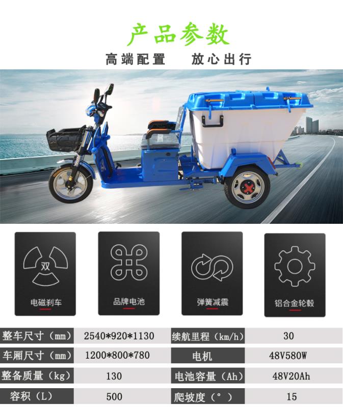 產(chǎn)品簡(jiǎn)介:整車(chē)尺寸(mm):2540*920*1130;車(chē)廂尺寸(mm):1200*800*780;箱體采用ABS材料,一次性注塑;箱體后傾,卸載自如,方便傾倒垃圾;
