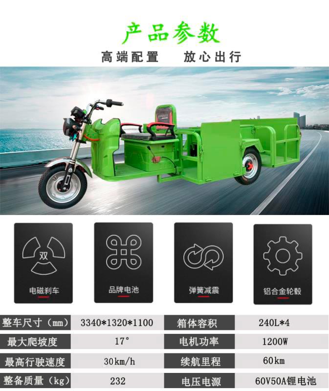 產(chǎn)品簡(jiǎn)介:型號:JA1500DZH-8,整車(chē)尺寸(mm):3340*1320*1100,箱體容積:4個(gè)240L垃圾桶,電機電壓60V